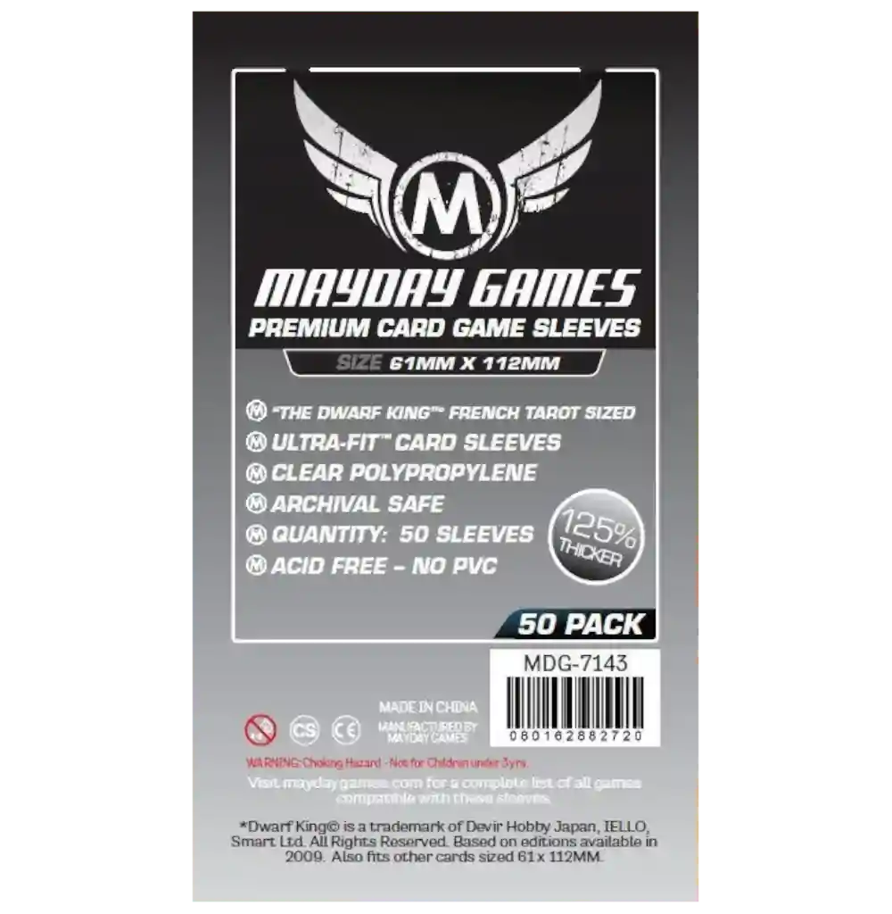 Las fundas Mayday Games Dwarf King Premium 61x112mm están diseñadas para proteger cartas de tamaño tarot francés, compatibles con Dwarf King y otros juegos que utilizan este formato. Con un grosor 125% más resistente, ofrecen máxima durabilidad y protección para tus cartas.