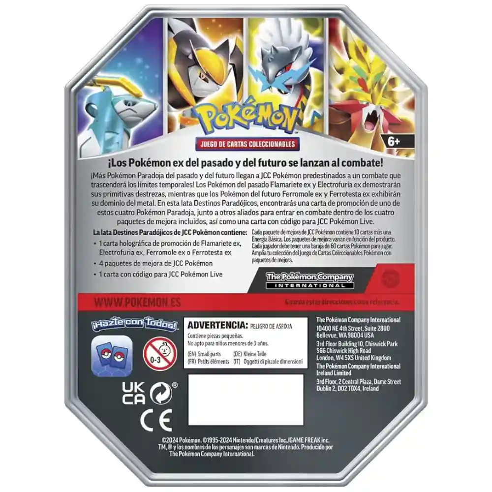 Además de la carta promocional de Ferrotesta EX, esta lata incluye 4 paquetes de mejora de la expansión Destinos Paradojicos. Estos paquetes contienen 10 cartas aleatorias cada uno, brindando la oportunidad de encontrar cartas raras y poderosas para fortalecer tu mazo y optimizar tu estrategia de juego.